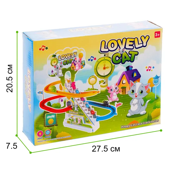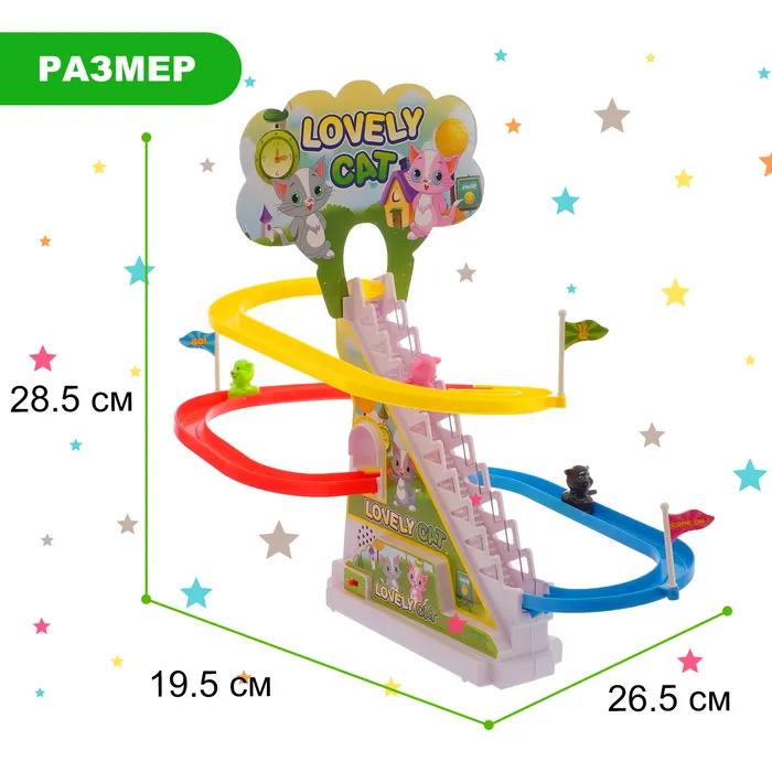 Вместе с малышом включайте игрушку и наблюдайте, как котики поднимаются по лесенке и скатываются с горки.