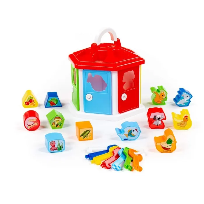 Красочный домик ТМ «Полесье» заинтересует малыша с первых минут и займёт его увлекательной игрой. В домике расположено 6 комнат с разноцветными дверями, каждая из них закрывается на уникальный замочек и имеет окошко в форме определённого животного. На крыше также есть отверстия для геометрических фигур. Кроха с большим интересом подберёт ключи ко всем замкам и расселит зверушек в подходящие для них отсеки.