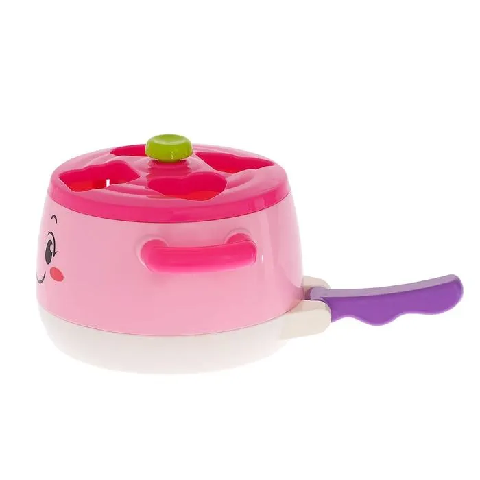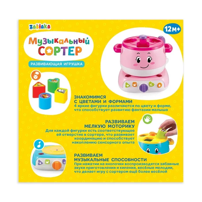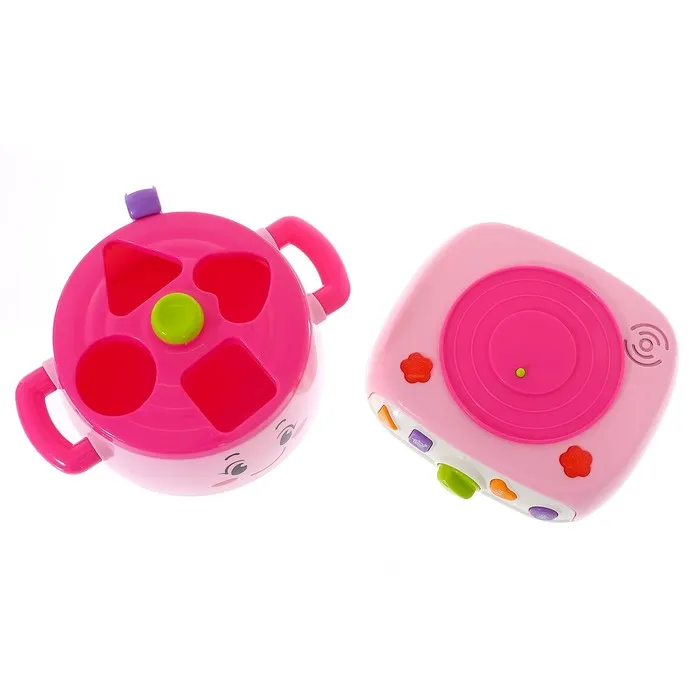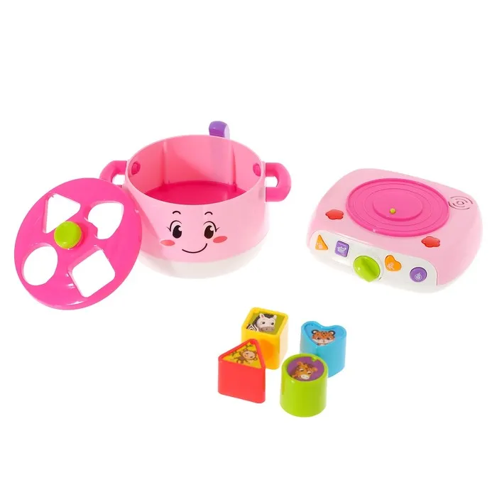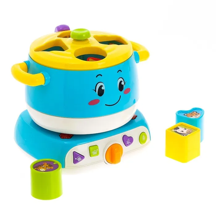 Для каждой фигурки есть своё отверстие в сортере. Опуская маленькую игрушку, ребёнок будет развивать координацию движений и мышление. Нажмите на кнопочку, и вы услышите звуки приготовления пищи и кипения, а также весёлые мелодии. Это сделает игру ещё интересней и реалистичнее.