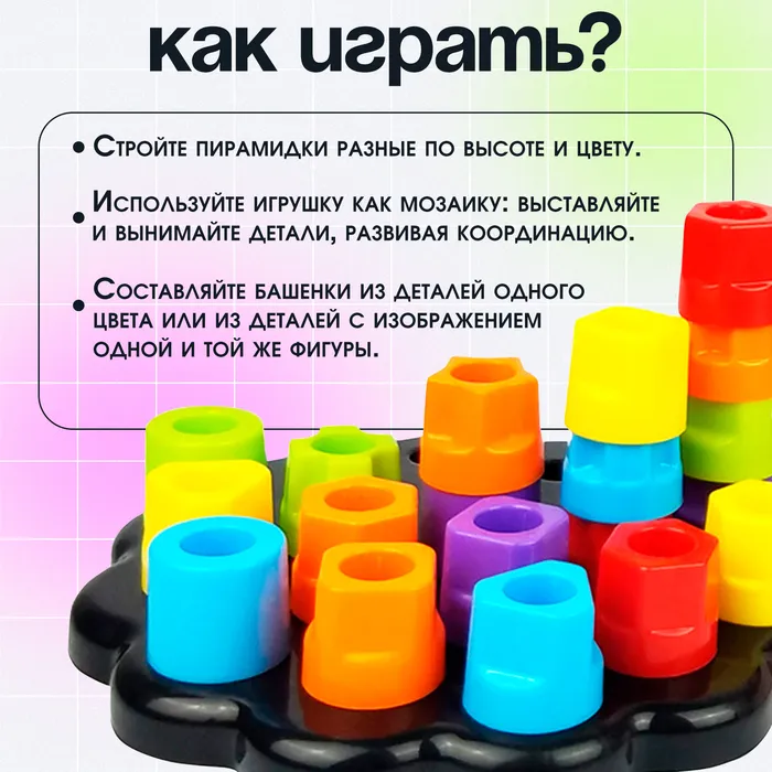 Увлекательный набор «Пирамидка-мозаика» поможет весело и с пользой провести время. Ребёнок улучшит координацию, прокачает мелкую моторику, разовьёт сенсорное восприятие, внимание и логическое мышление.