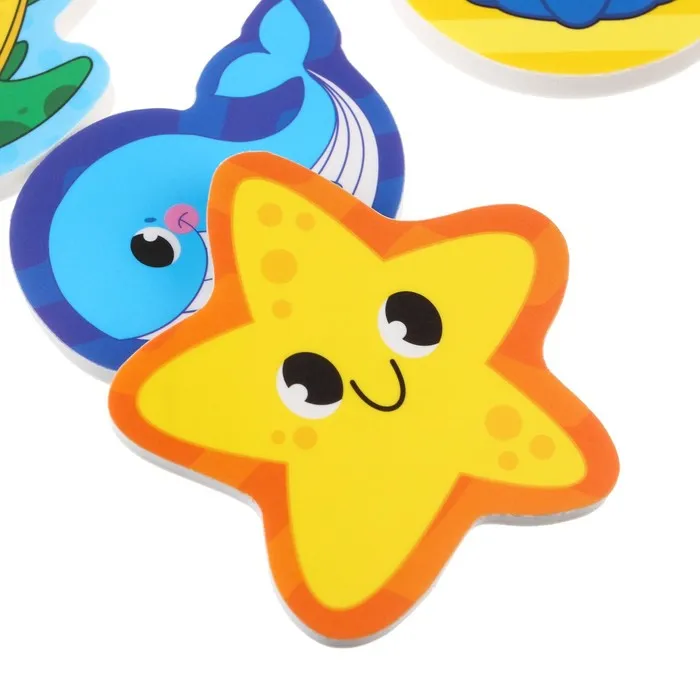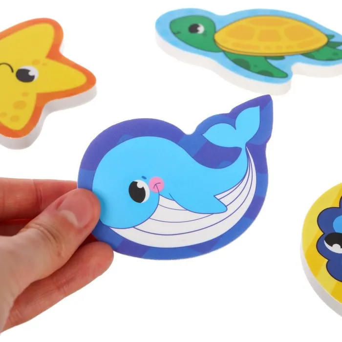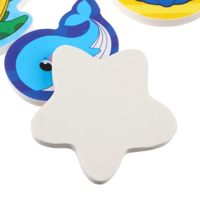 Забавные игрушки из мягкого материала не тонут в воде и при намокании приклеиваются к кафелю или ванне.
