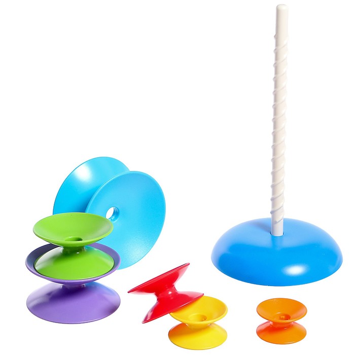 - Возьмите стержень и круглые детали и предложите малышу составить пирамидку от самой большой детали у основания к самой маленькой наверху. Если у ребёнка не получится с первого раза, скажите ему, как нанизывать фигурки на стержень. А затем попробуйте сложить пирамидку без использования каркаса.