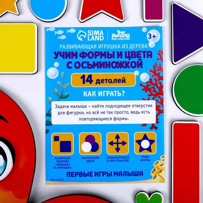 С помощью рамки-вкладыша ребёнок познакомится с геометрическими фигурами и разными цветами. Для большей продуктивности занимайтесь вместе с ребёнком, озвучивайте название каждой фигуры и цвета, так малыш быстрее запомнит их.