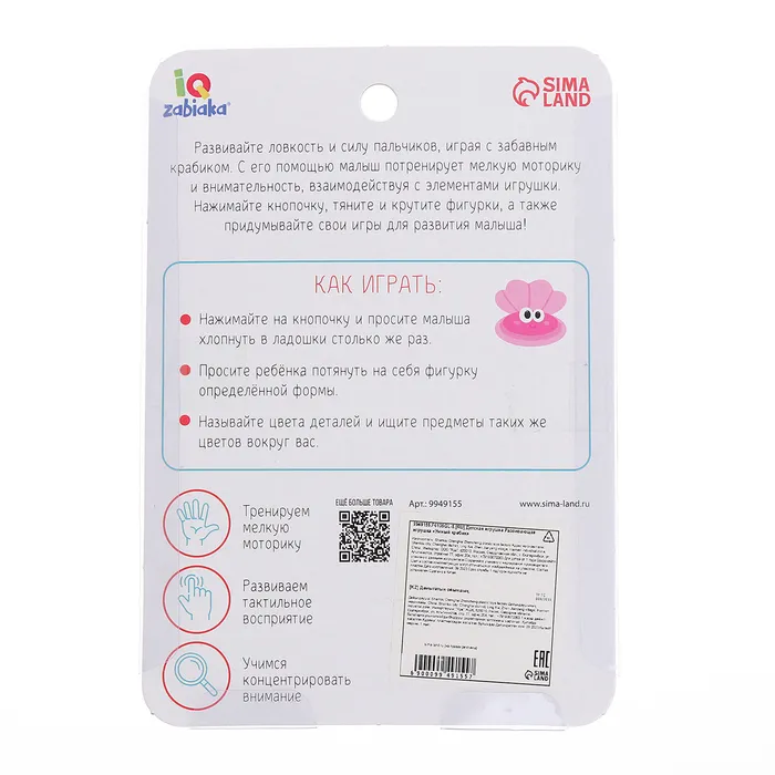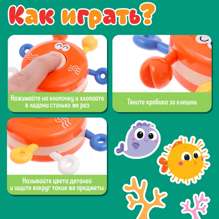Игра с крабиком помогает малышу улучшать мелкую моторику, тактильное восприятие и концентрацию внимания. Каждое действие с игрушкой — это шаг к новым открытиям и навыкам. Простые, но увлекательные элементы делают игру интересной и полезной.