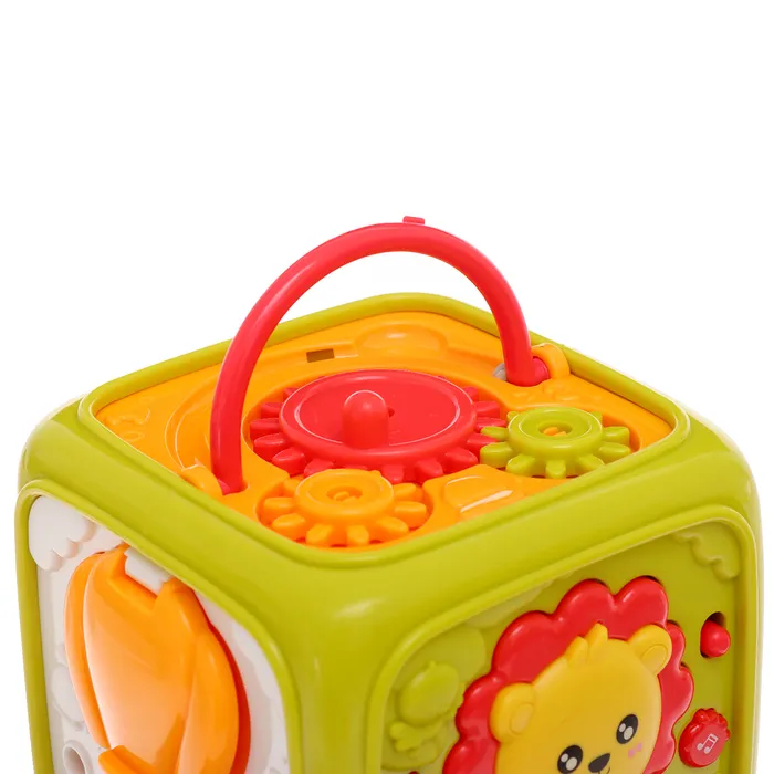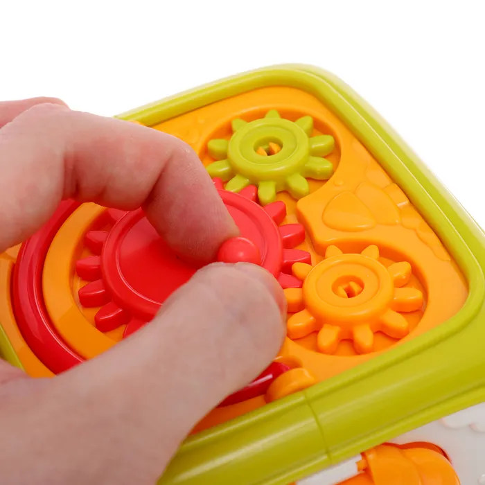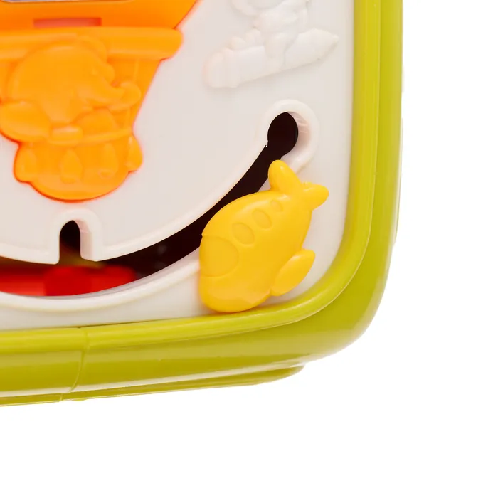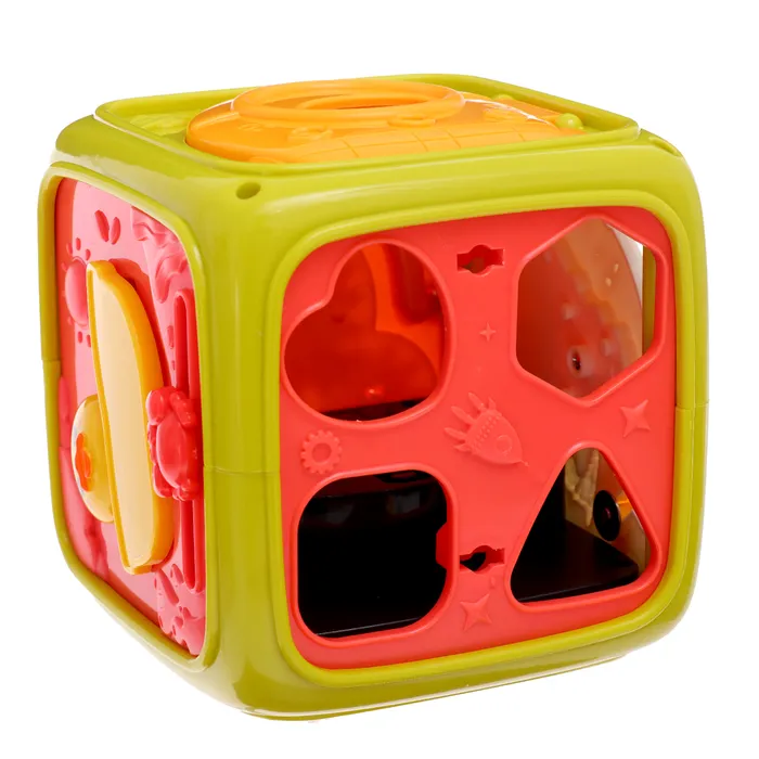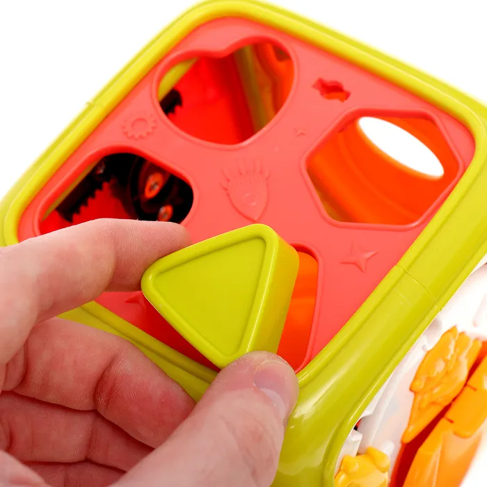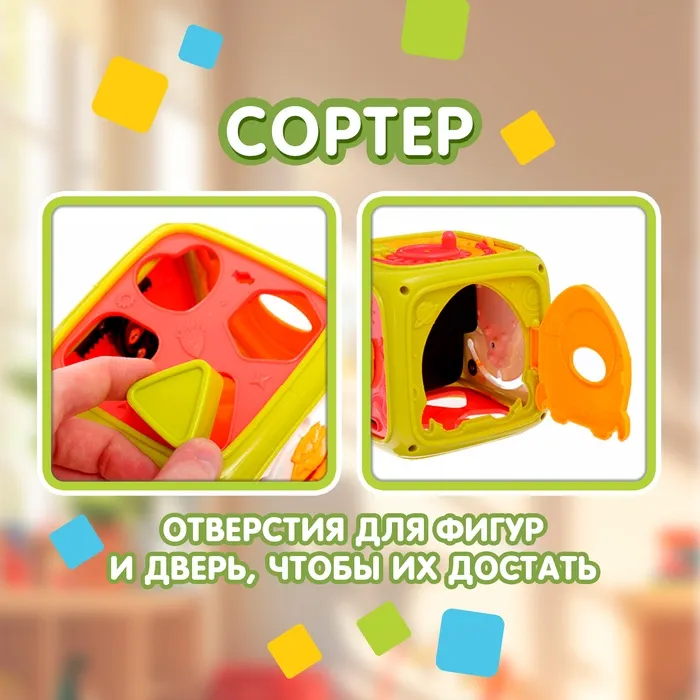 - Сортер — на одной из сторон кубика расположены отверстия для фигурок. После того как малыш поместит все формы в отверстия, он сможет открыть специальную дверцу и достать их обратно, что способствует развитию логики и мелкой моторики.
