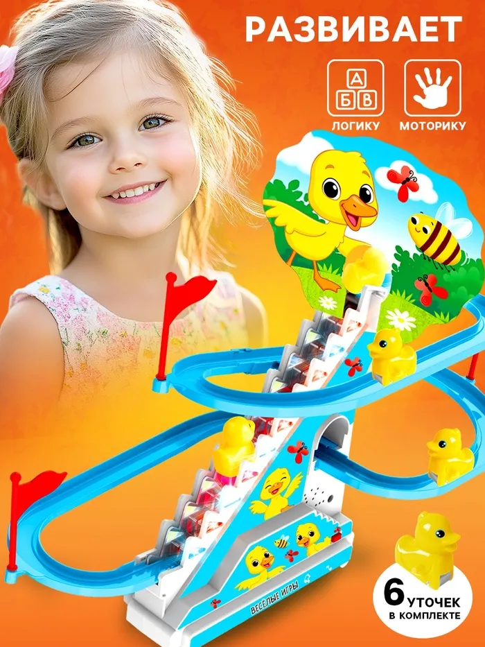 - Утята сами поднимаются по эскалатору и скатываются с горки.