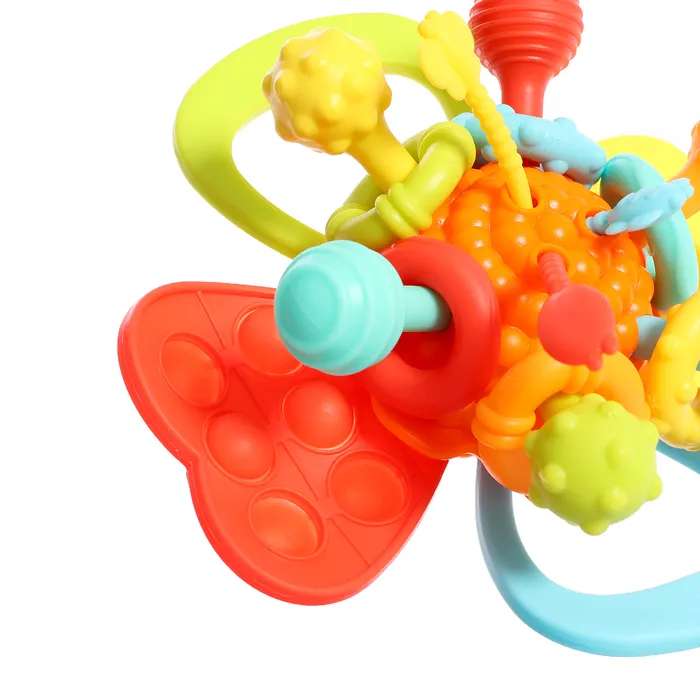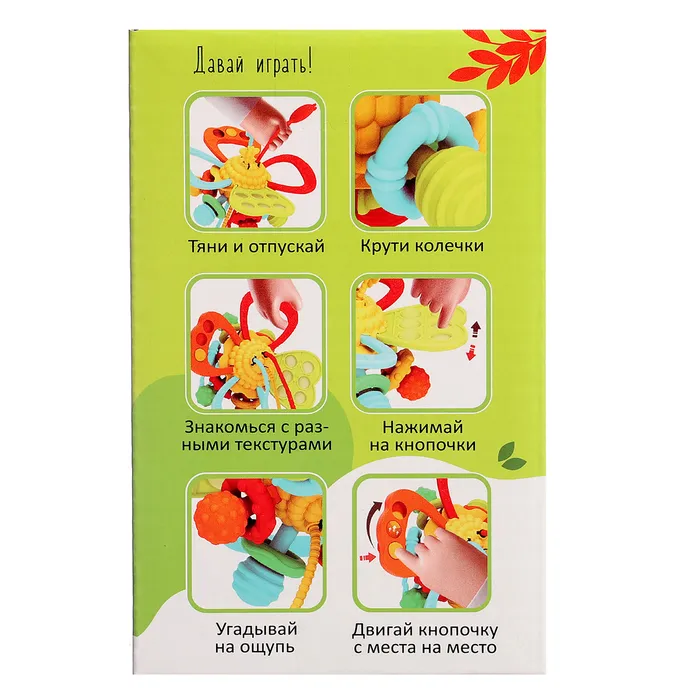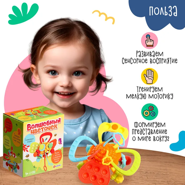 Развивающая игрушка «Волшебный цветочек» с мягкими и приятными на ощупь деталями развивает сенсорное восприятие ребёнка. Подойдёт для любознательных малышей от 1 года. Нажимайте на кнопочки, тяните резиночки, крутите фигурки и придумывайте свои игры.