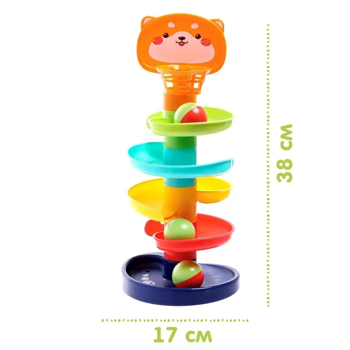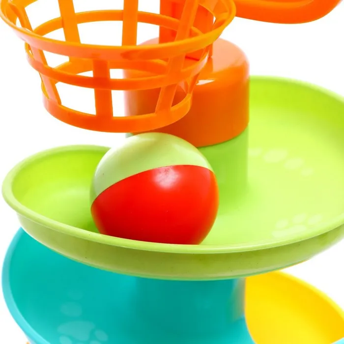 Малыш будет бросать разноцветные шарики в корзинку, и следить, как они скатываются с горки по спирали.