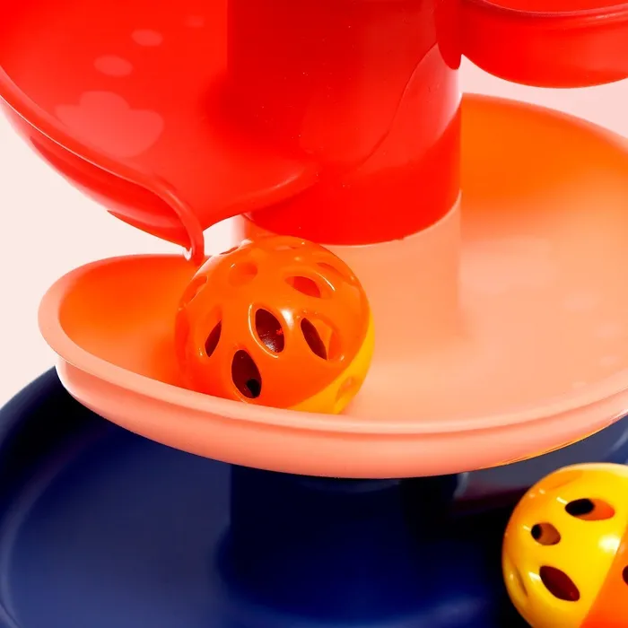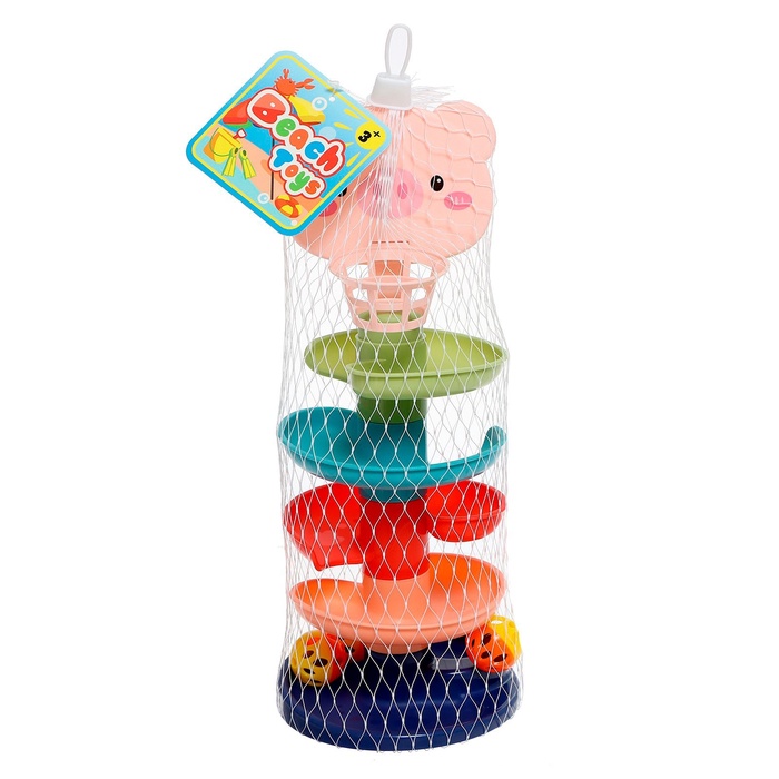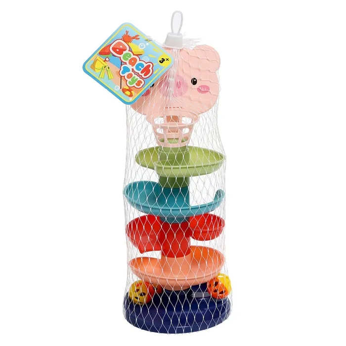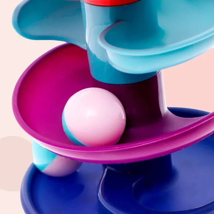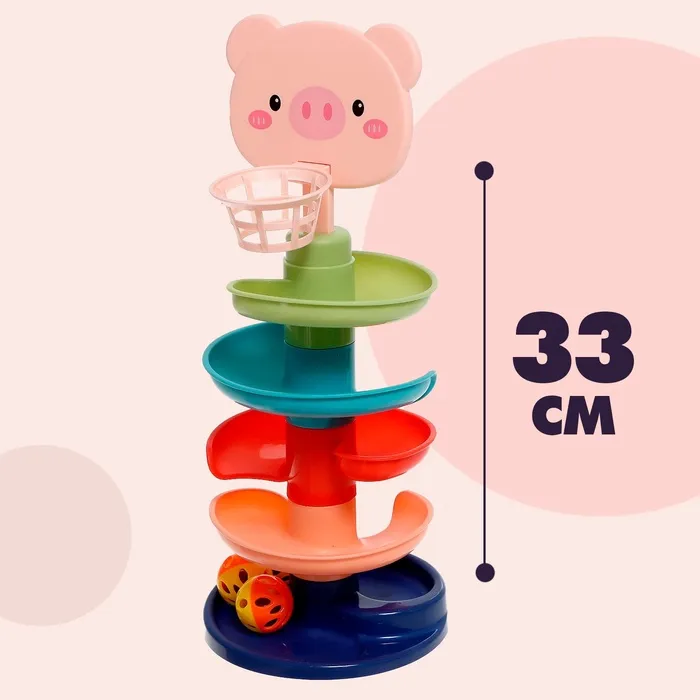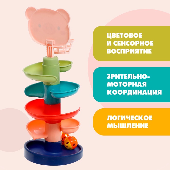 Малыш будет бросать разноцветные шарики в корзинку, и следить, как они скатываются с горки по спирали.