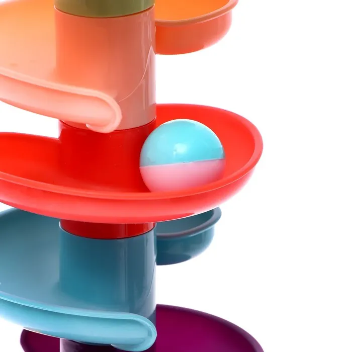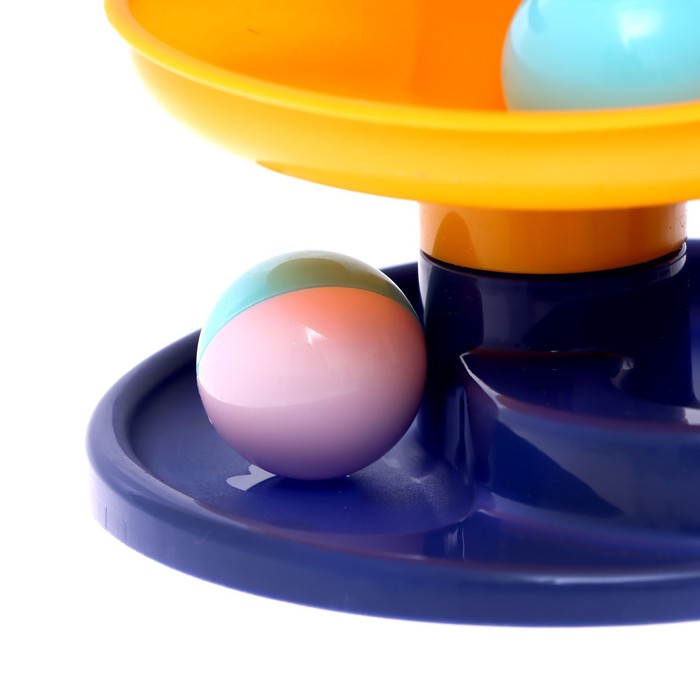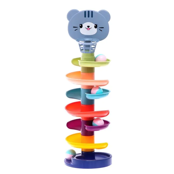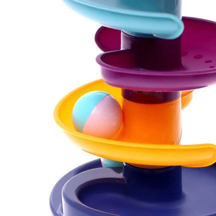Малыш будет бросать разноцветные шарики в корзинку, и следить, как они скатываются с горки по спирали.