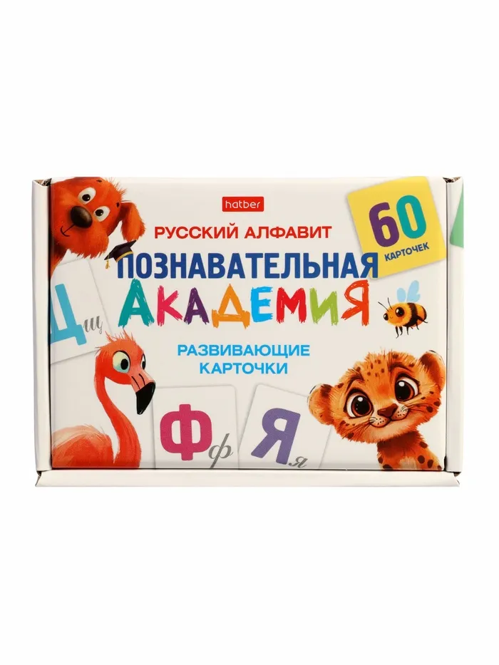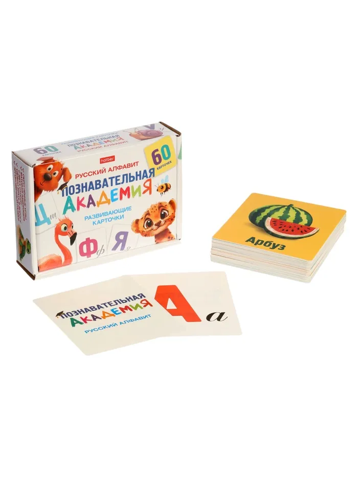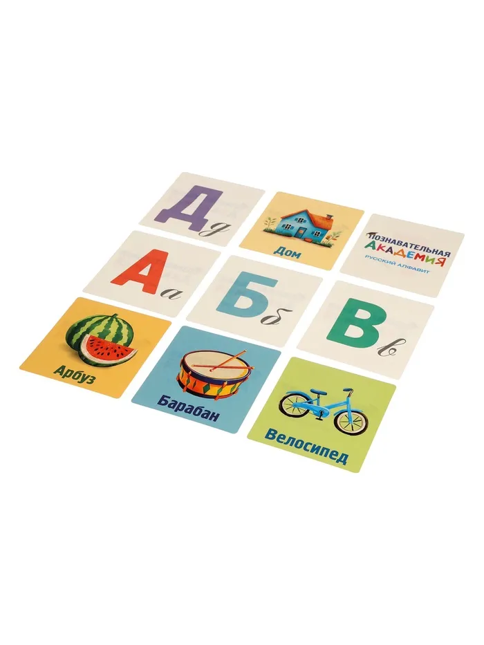 Учите буквы и слова с удовольствием! Развивающие карточки «Познавательная академия. Русский алфавит» — это яркий и удобный набор для первых шагов в чтении. Тактильно приятные карточки с буквами, словами и иллюстрациями превратят изучение русского языка в увлекательную игру.