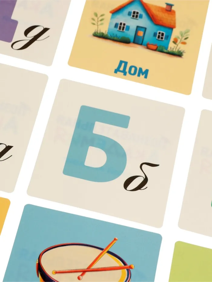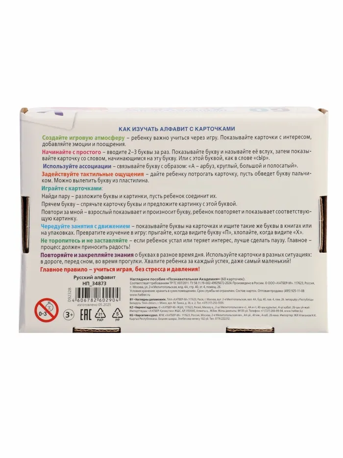 - 60 карточек с русским алфавитом — каждая карточка — это буква, слово-пример и красочное изображение. Ребёнок легко запоминает азбуку, расширяет словарный запас и развивает ассоциативное мышление.