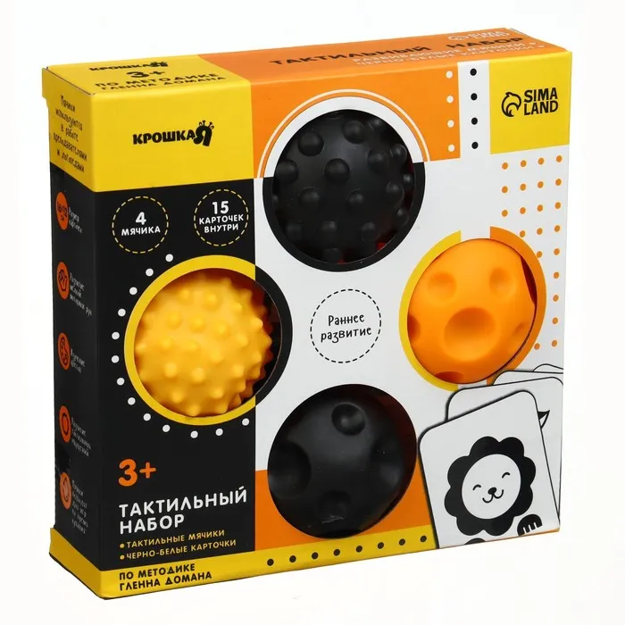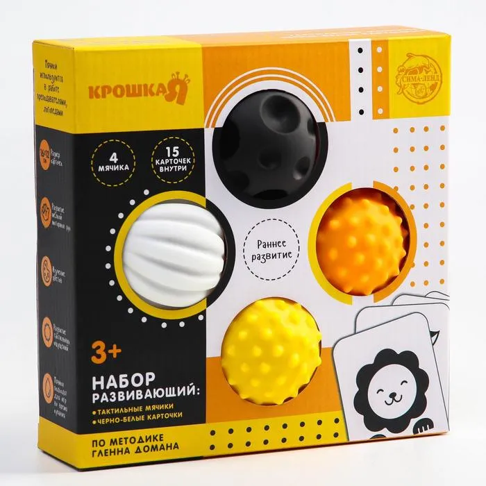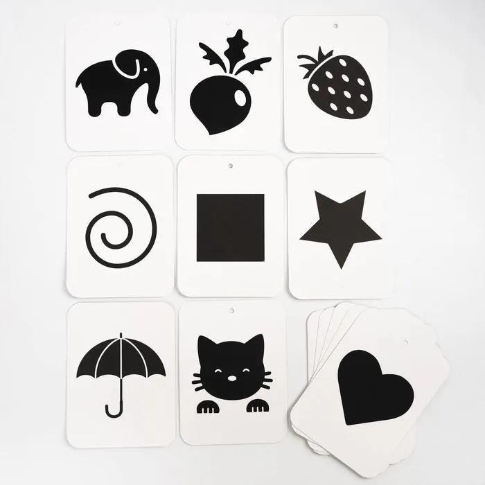 В наборе вы найдете 15 двусторонних карточек с геометрическими фигурами, простыми и сложными узорами, с силуэтами животных. Прикрепите карточки к мобилю, разместите их на кроватке, коляске и позвольте малышу их рассматривать.