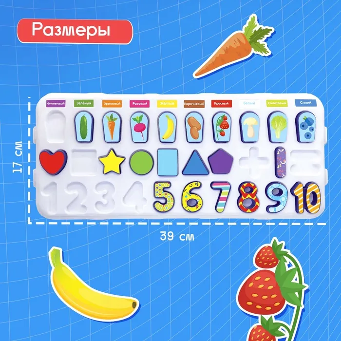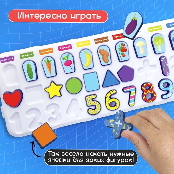 Развивающий бизиборд «Что где растёт?» — это многофункциональная доска, с помощью которой ребёнок познакомится с цифрами и основами счёта, повторит названия цветов и плодов, выучит названия геометрических фигур и научится их различать.