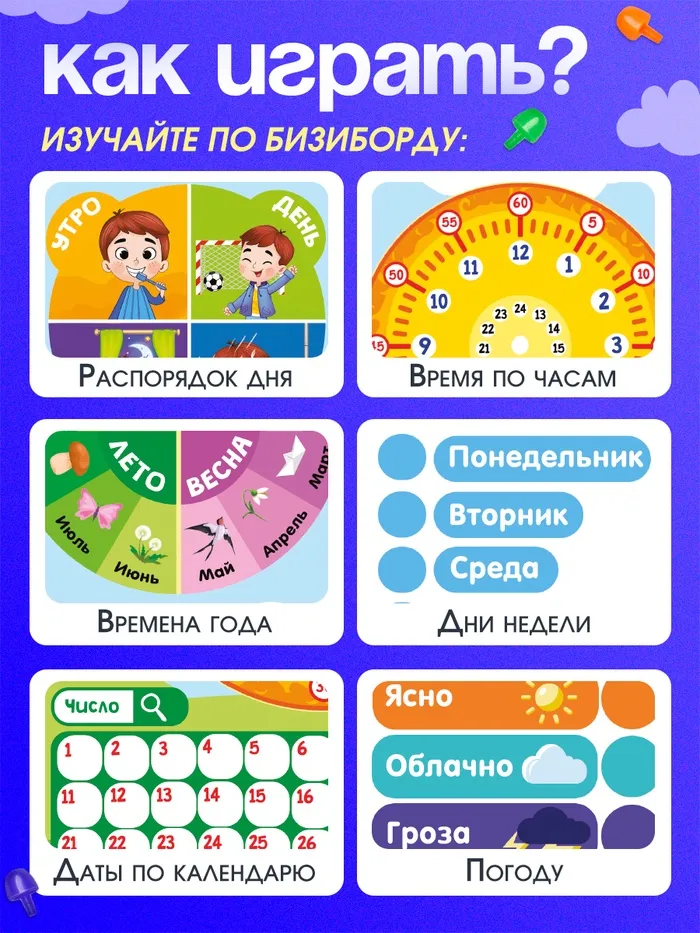 Бизиборд поможет ребёнку разобраться с понятием времени без скучных объяснений. Он сам будет крутить стрелки, устанавливать дату и анализировать изменения погоды. Такая игра развивает внимание, мышление и закрепляет полученные знания в повседневной жизни.