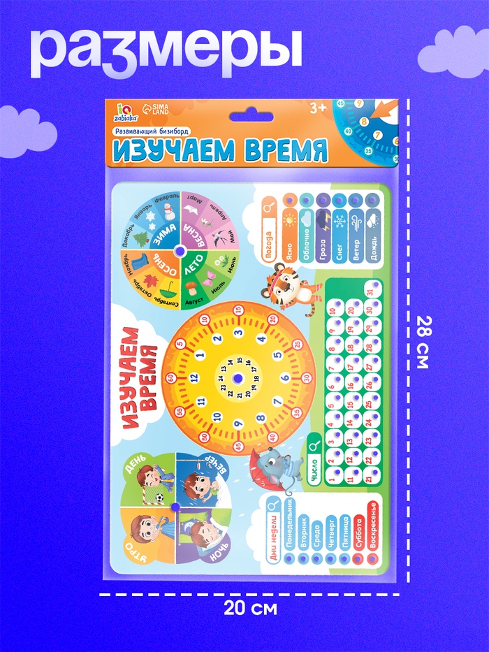 Бизиборд «Что такое время?» — это увлекательная развивающая игра для детей от 3 лет, которая поможет освоить понятие времени в игровой форме. Ребёнок познакомится с распорядком дня, часами, временами года, погодой, днями недели и календарём, что сделает обучение лёгким и увлекательным.