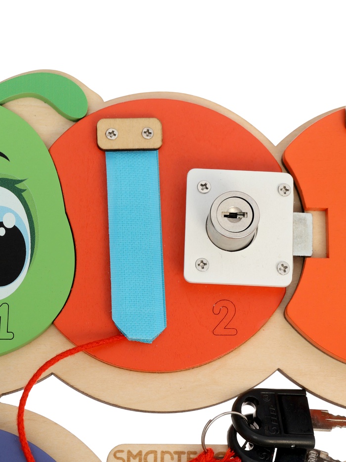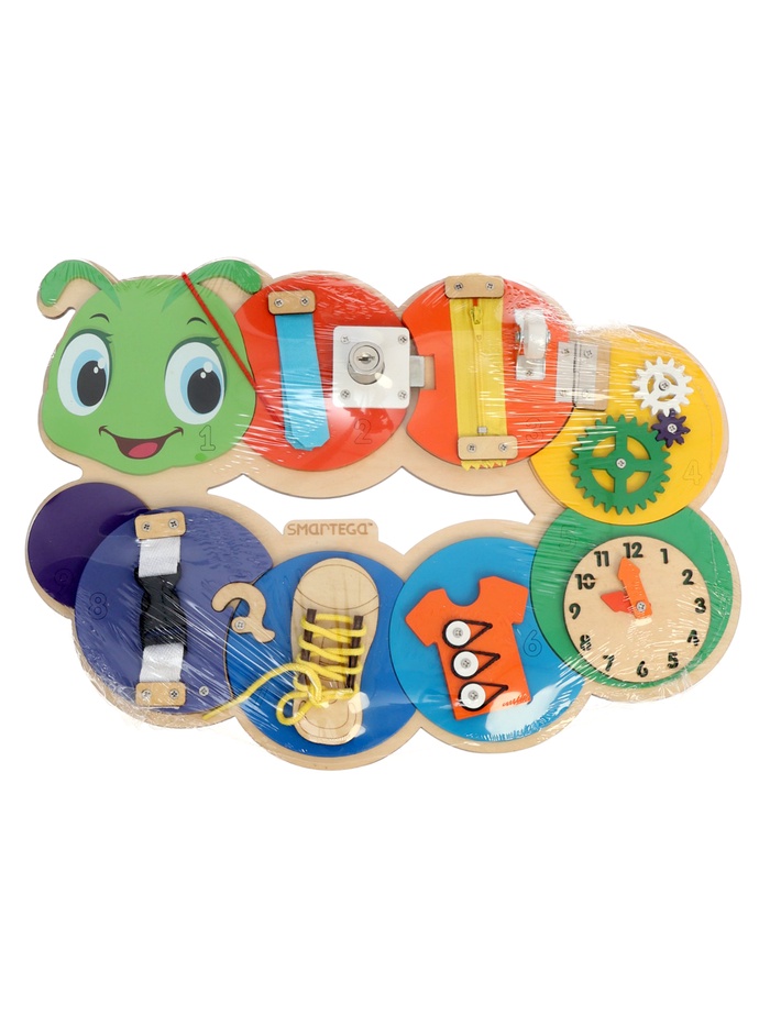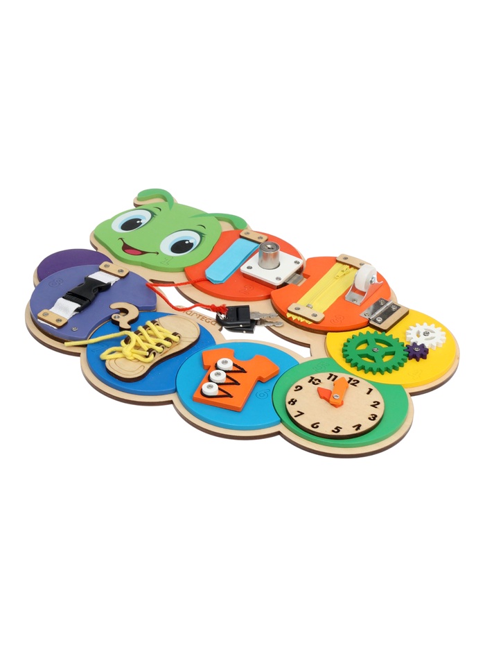Бизиборд «Гусеница» — яркая развивающая панель для детей, которая помогает знакомиться с бытовыми навыками, улучшать мелкую моторику и тренировать логическое мышление в игровой форме.