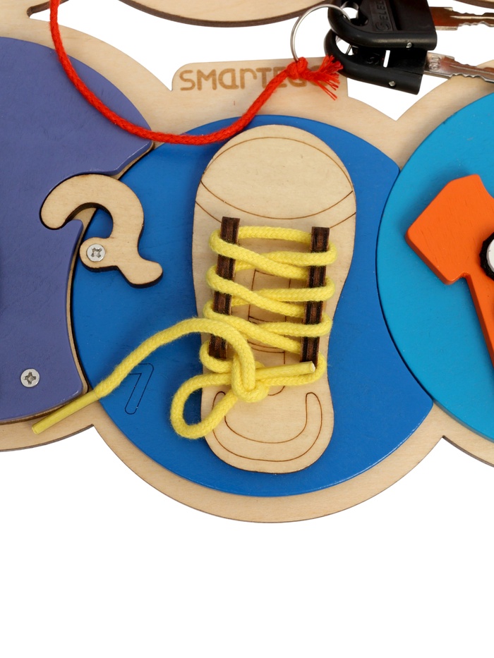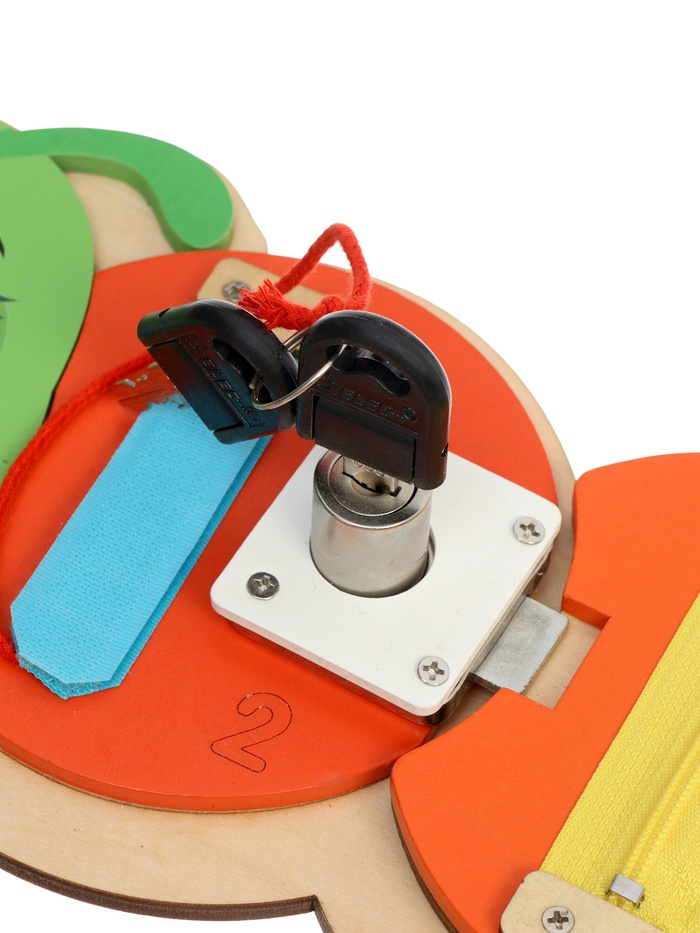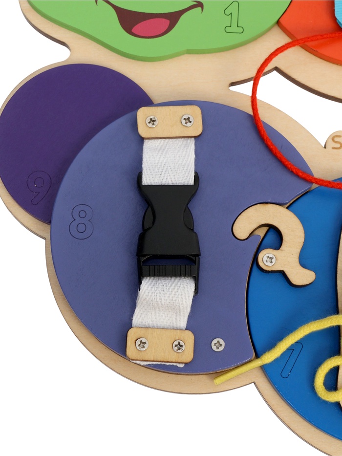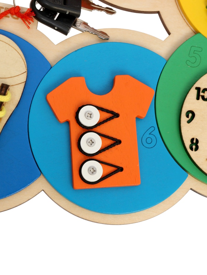- 9 развивающих зон: замочек с ключами, молния, шестерёнки, часы со стрелочками, пуговицы с петельками, шнуровка и застежка