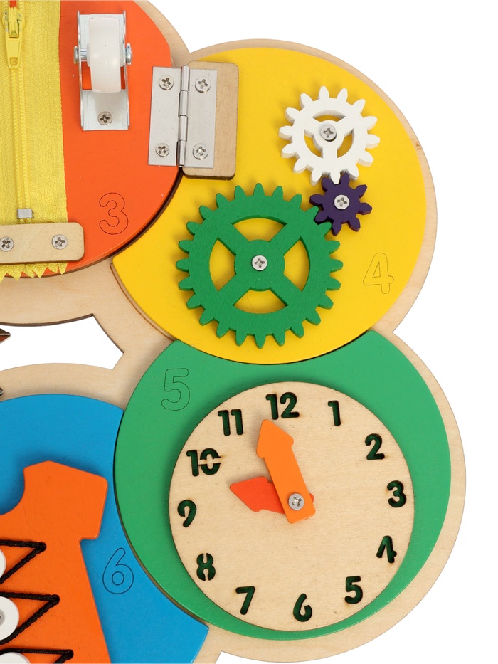 - Интерактивность: вращаются шестерёнки, открываются дверцы, можно завязывать шнурки и учиться застёгивать одежду.