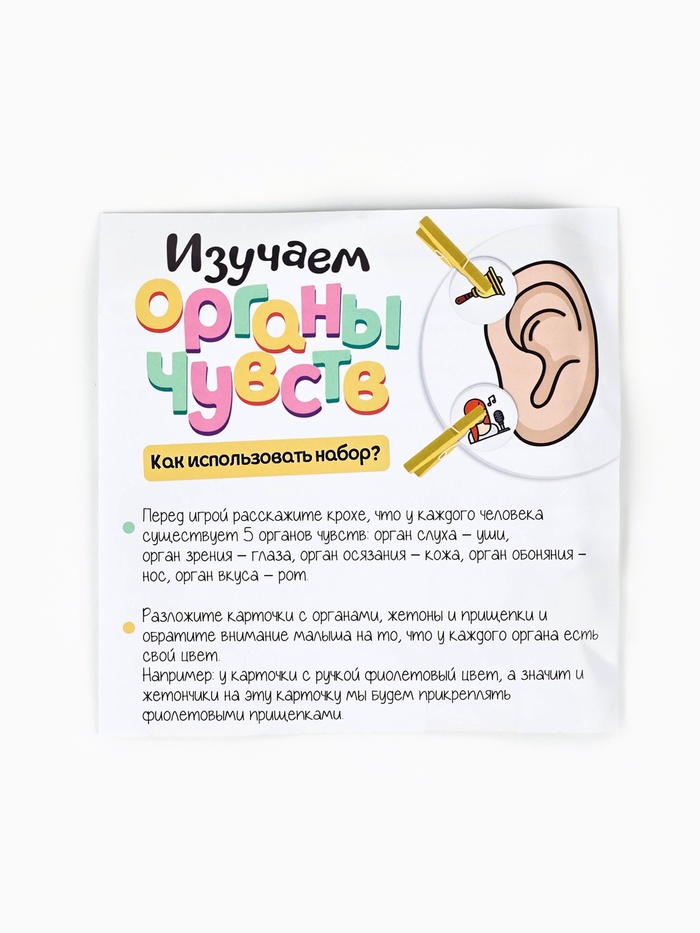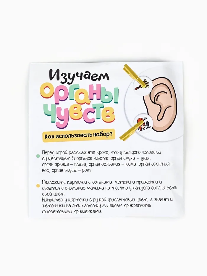 Развивающий игровой детский набор «Органы чувств» - это увлекательное путешествие в мир познания, где каждый ребёнок становится настоящим исследователем своих возможностей! Яркие карточки, интересные задания и весёлые игры помогут малышам познакомиться с пятью основными органами чувств в игровой форме.