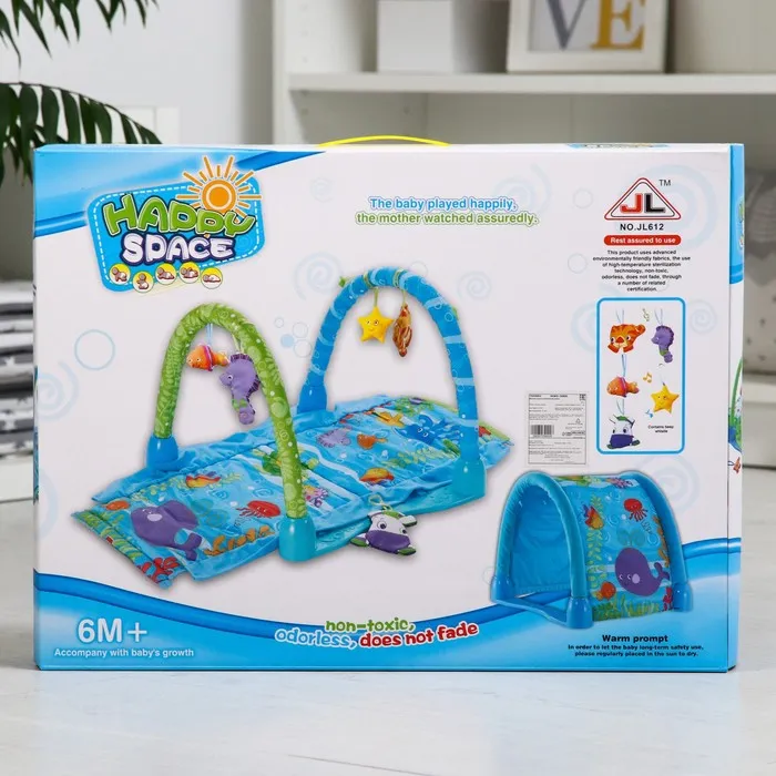 Малыш играет на спинке лёжа. На самом раннем этапе своего развития малыш тянется за яркими, притягивающими внимание игрушками и учится их хватать, так же малыш видит свое отражение в безопасном зеркальце и улыбается. В комплекте с ковриком прилагаются подвесные игрушки, яркие и привлекательные, они служат для развития тактильных ощущений и зрения.