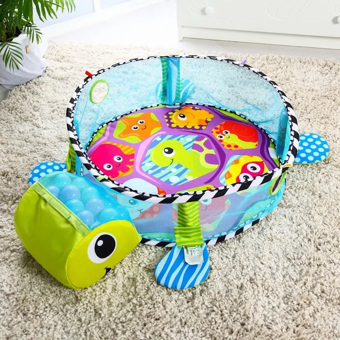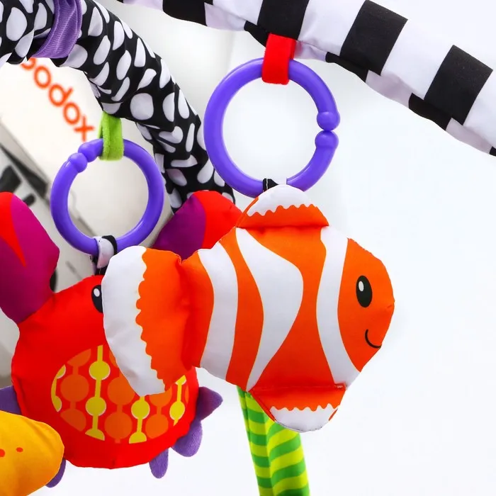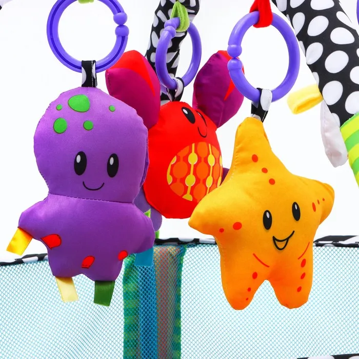 Малыш играет на спинке лёжа. На самом раннем этапе своего развития малыш тянется за яркими, притягивающими внимание игрушками и учится их хватать. В комплекте с ковриком прилагаются подвесные игрушки, яркие и привлекательные, они служат для развития тактильных ощущений и зрения.