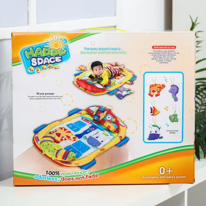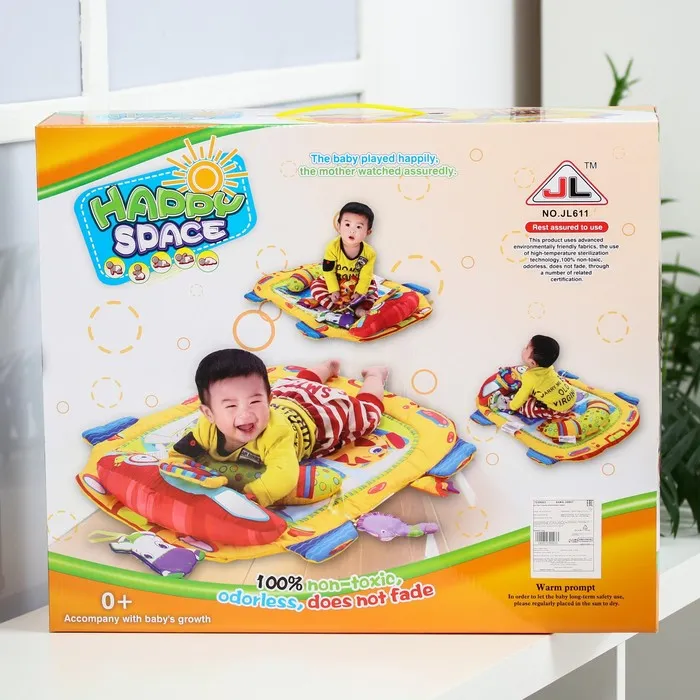 Малыш играет на спинке лёжа. На самом раннем этапе своего развития малыш тянется за яркими, притягивающими внимание игрушками и учится их хватать, так же малыш видит свое отражение в безопасном зеркальце и улыбается. В комплекте с ковриком прилагаются подвесные игрушки, яркие и привлекательные, они служат для развития тактильных ощущений и зрения.