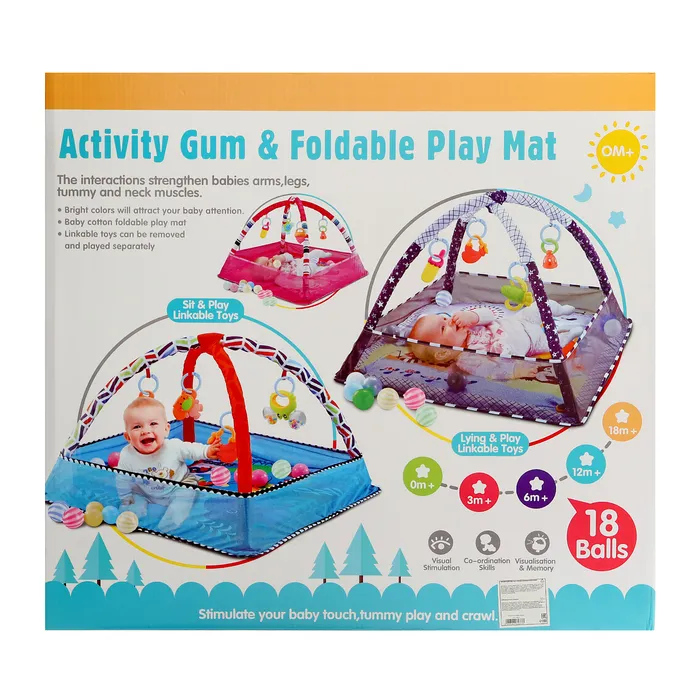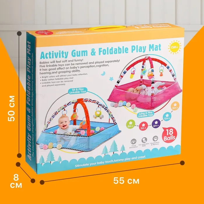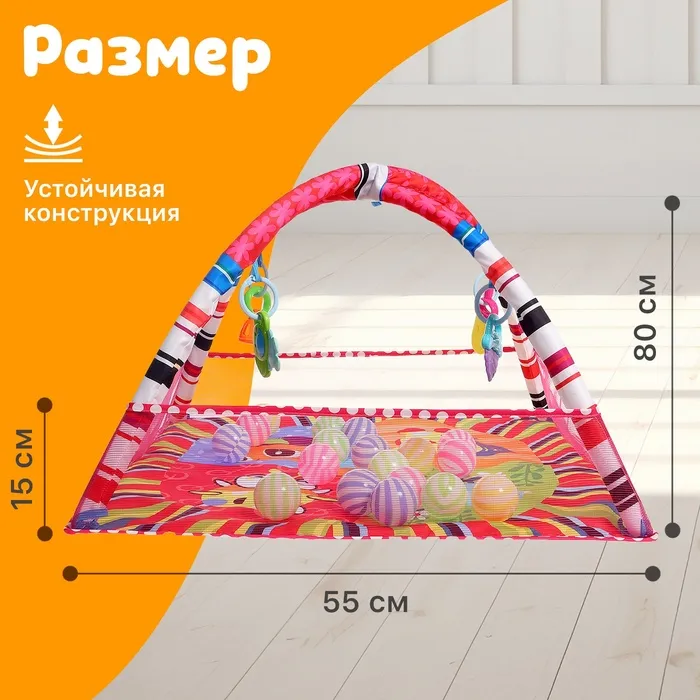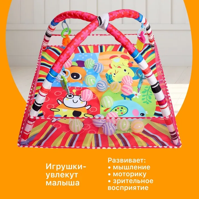 Развивающий коврик с бортами для малышей станет первым игровым пространством для вашего ребёнка. Это удобное место для игр, отдыха и развития, где малыш будет чувствовать себя комфортно и безопасно. В комплект входят 18 разноцветных шариков и 4 подвесные игрушки с прорезывателем, которые сделают игру увлекательной и полезной.
