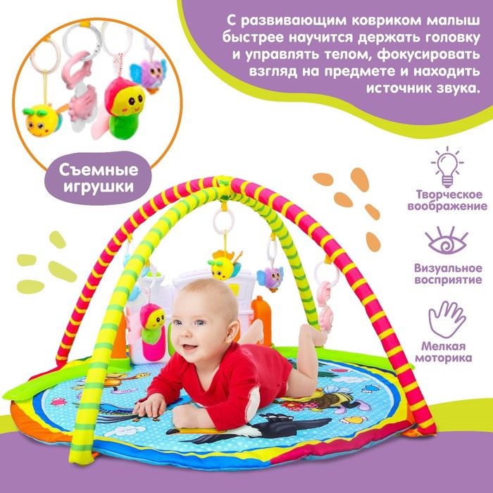 Малыш играет на спинке лёжа. На самом раннем этапе своего развития малыш тянется за яркими, притягивающими внимание игрушками и учится их хватать. В комплекте с ковриком прилагаются подвесные игрушки, яркие и привлекательные, они служат для развития тактильных ощущений и зрения.
