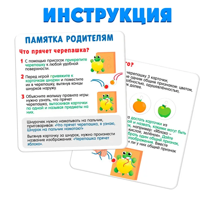 - Объясните малышу правила игры: нужно узнать, что прячет черепашка, вытаскивая карточки по одной и называя предметы на них.