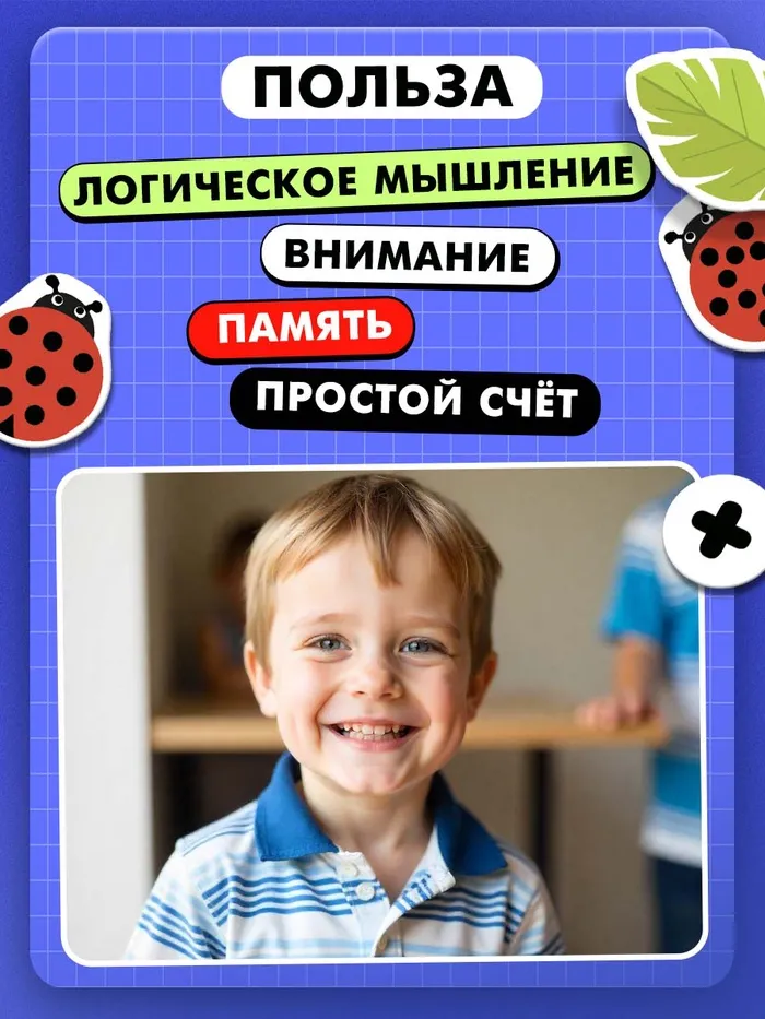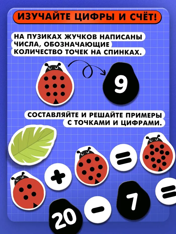 Развивающий набор «Числовые букашки» в форме игры делает процесс обучения простым и интересным. Ребёнок сможет сравнивать количества, искать пары, решать примеры, тренировать память и анализировать информацию.