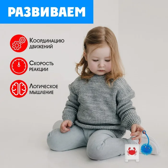- Малышу нужно поднять согнутую руку перед собой на уровне груди и отпустить шарик. Но не дать ему упасть и успеть поймать прежде, чем натянется резиночка, ведущая к кольцу.