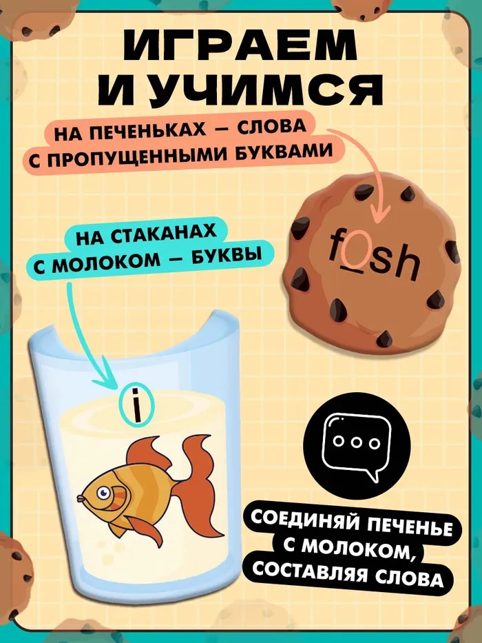 В наборе вы найдёте стаканы с молоком и печеньки, на которых написаны английские слова с пропущенной буквой. Задача крохи — соединить правильные печеньки и стаканы с молоком, чтобы получились слова.