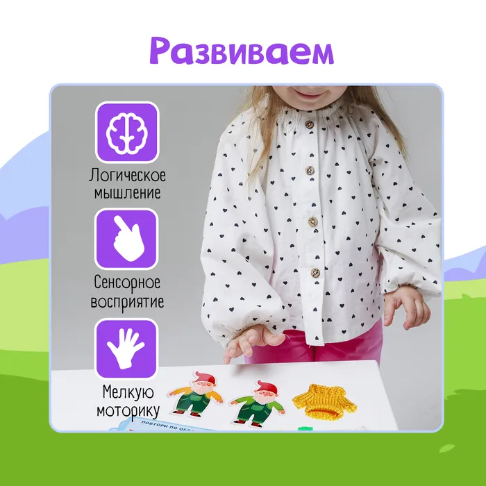 - Попросите малыша надеть на гномиков свитера в цвет кофточек на них. Затем попросите снять с гномиков свитера и переодеть их, следуя вашим указаниям.