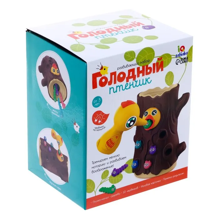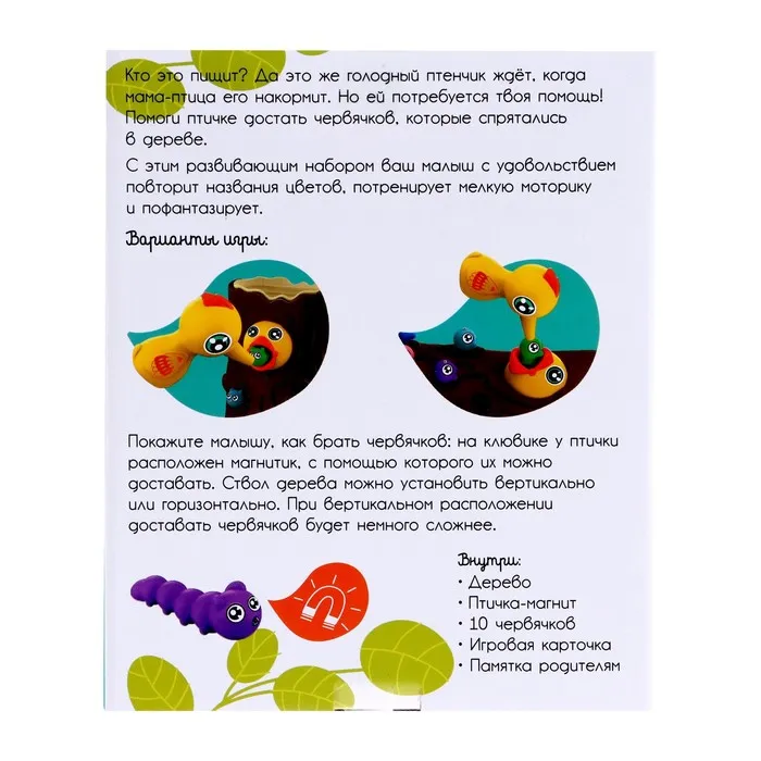 В комплекте дерево, птичка-магнит, 10 червячков и памятка для родителей.