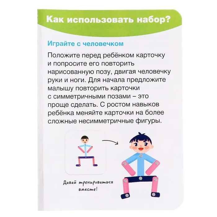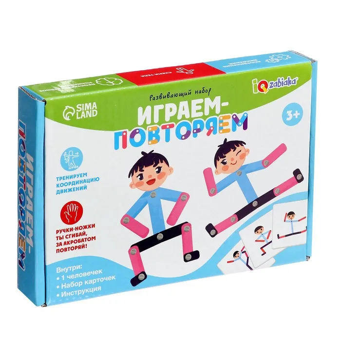 Развивающий набор «Играем-повторяем» разработан для тренировки координации и крупной моторики. Повторяя движения за весёлым человечком, ребёнок научится изображать различные позы, выучит названия частей тела и слова описывающие пространства.
