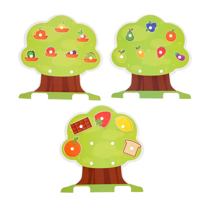 Развивающий набор «IQ-дерево» разработан специально для малышей от 3 лет. С его помощью вы не только познакомите ребёнка с названиями фруктов и овощей, но и потренируете знание геометрических фигур, ассоциативное мышление и мелкую моторику.
