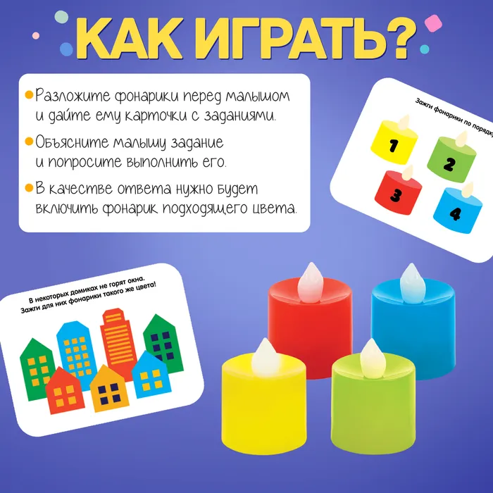 - Включите и расставьте фонарики перед малышом, затем дайте ему карточки с заданиями.