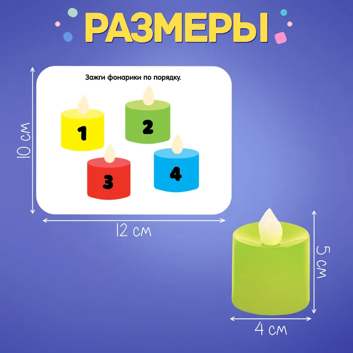 - Перед игрой вставьте в каждую свечку по 3 батарейки типоразмера LR1130.
