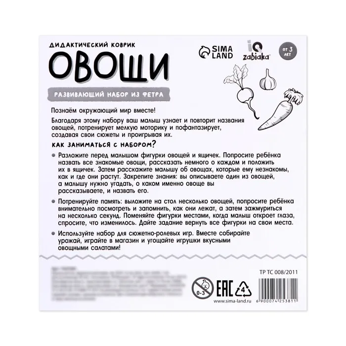 Благодаря этому набору ваш малыш узнает и повторит названия овощей, потренирует мелкую моторику и пофантазирует, создавая свои сюжеты и проигрывая их.