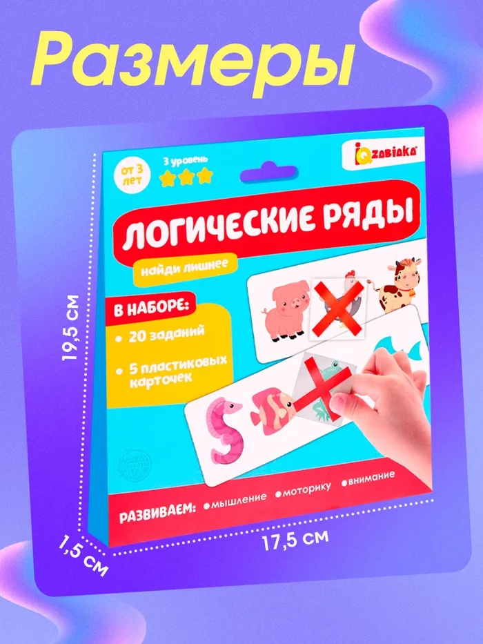 Развивающий набор «Логические ряды: найди лишнее. 3 уровень» создан для детей от 3 лет. В комплект входит 20 заданий и 5 пластиковых карточек.