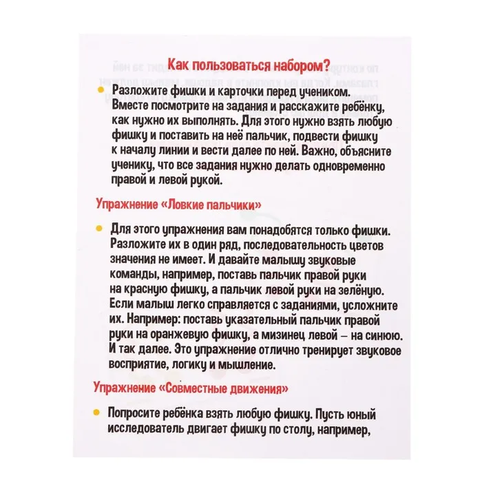 Развивающий набор «Ловкие фишки», межполушарное развитие, 10 карточек, 3+ — Характеристики