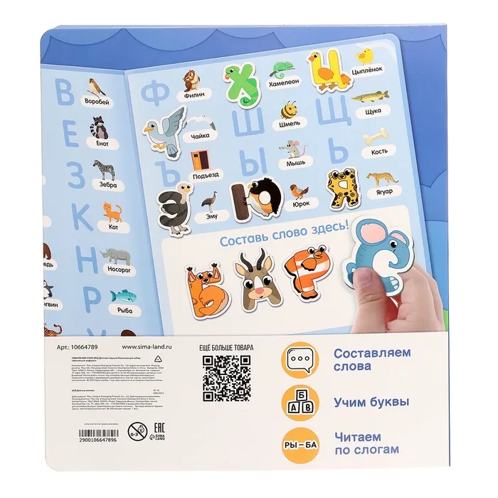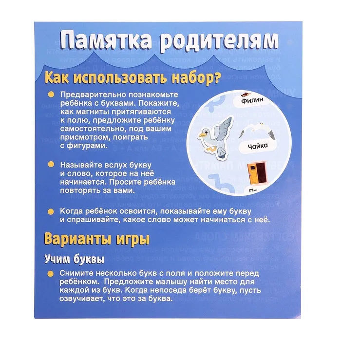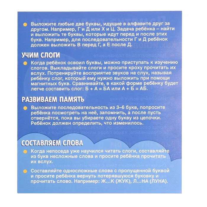 • Содержит 63 магнитные буквы русского алфавита.