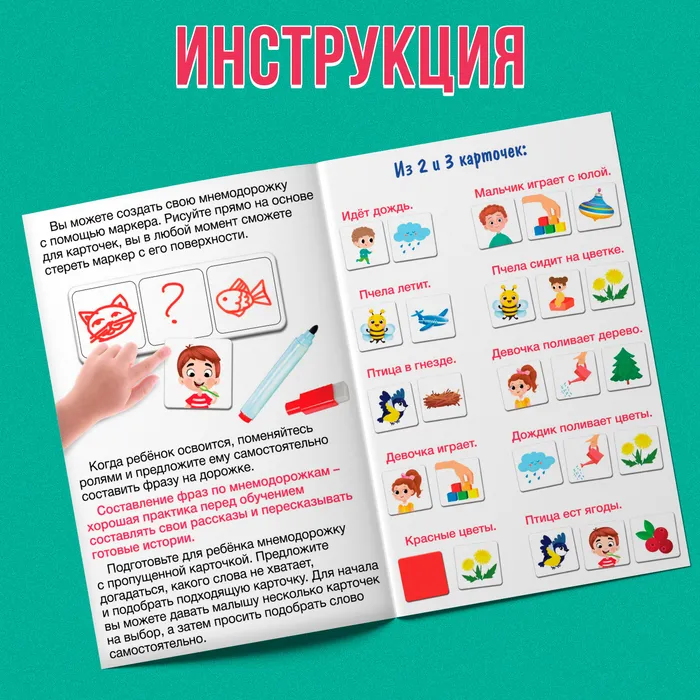 Развивающий набор «Мнемодорожки» — это фразы, зашифрованные в виде схематичных изображений. С помощью карточек вы научите малыша составлять предложения, читать их и быстро запоминать информацию.
