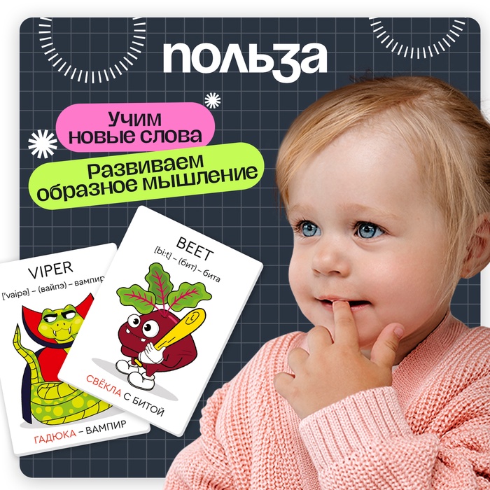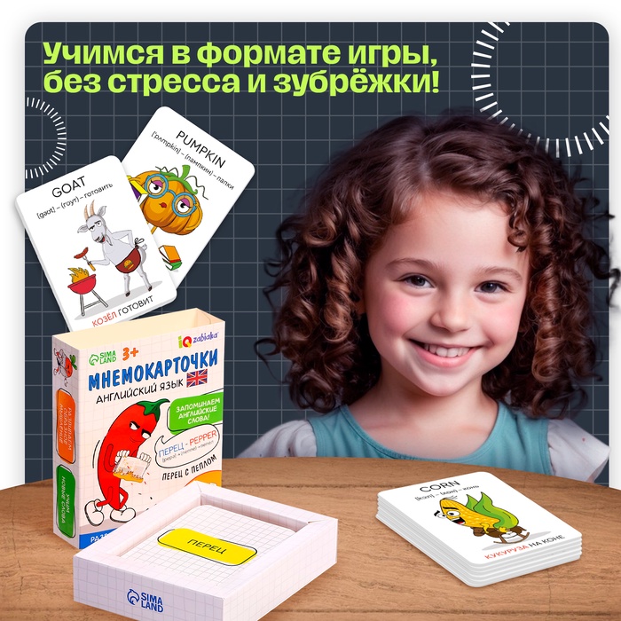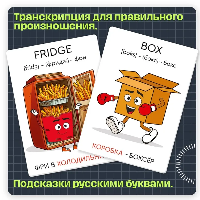 «Мнемокарточки» — развивающий набор для детей от 3 лет. Забавные ассоциации помогут малышу в увлекательной форме выучить новые английские слова и весело провести время.