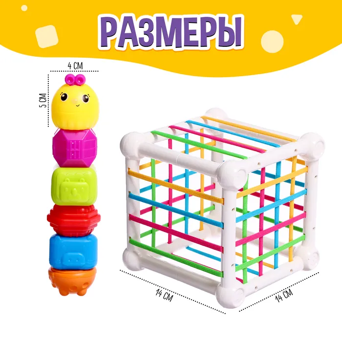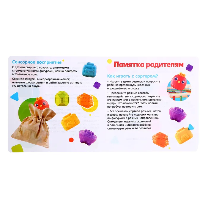 - Сортер с гибкими резиночками для безопасного и увлекательного взаимодействия.