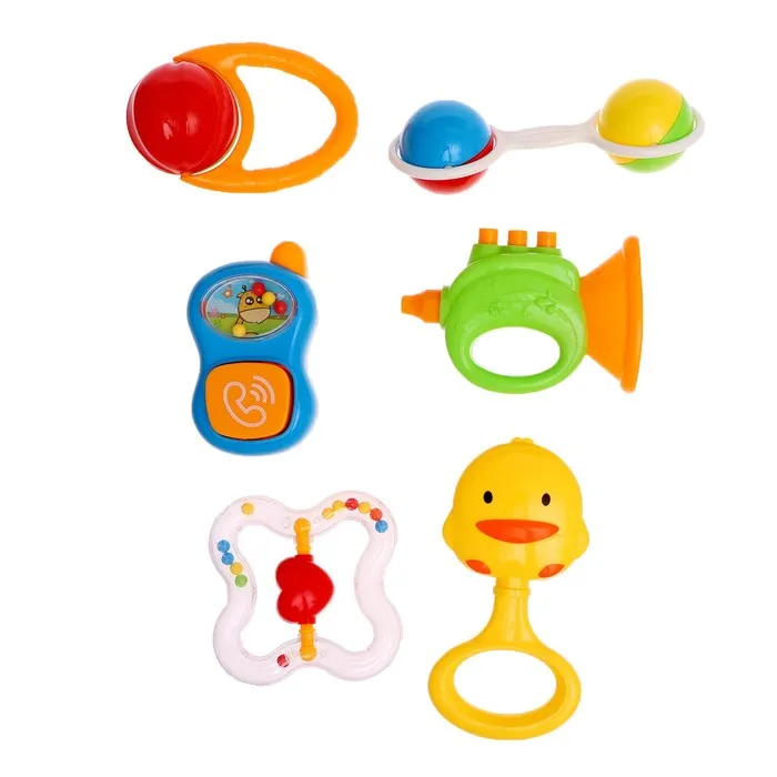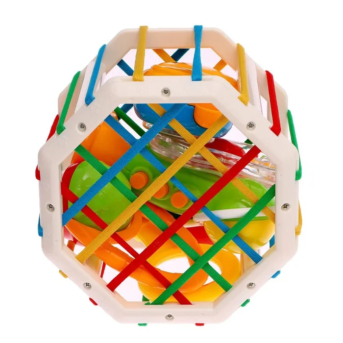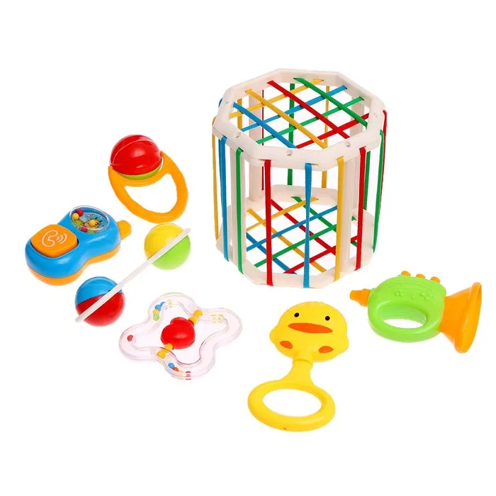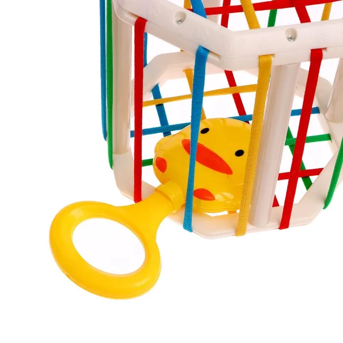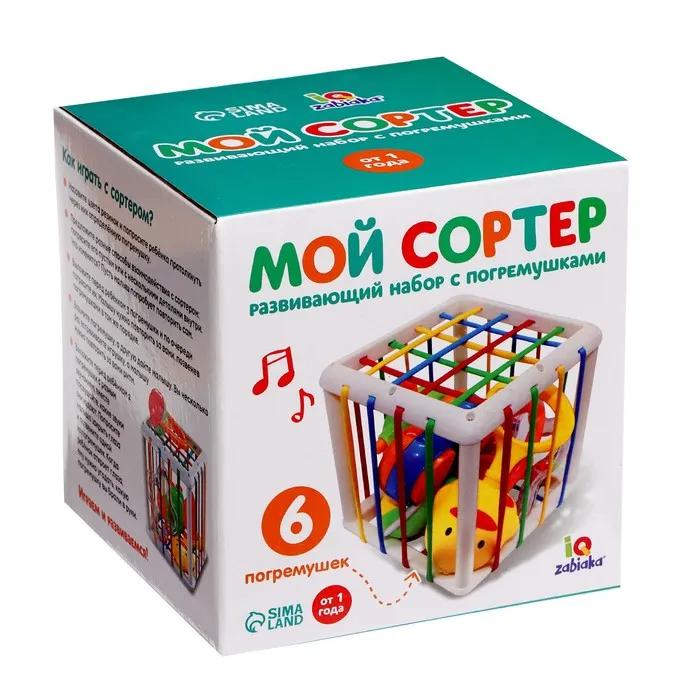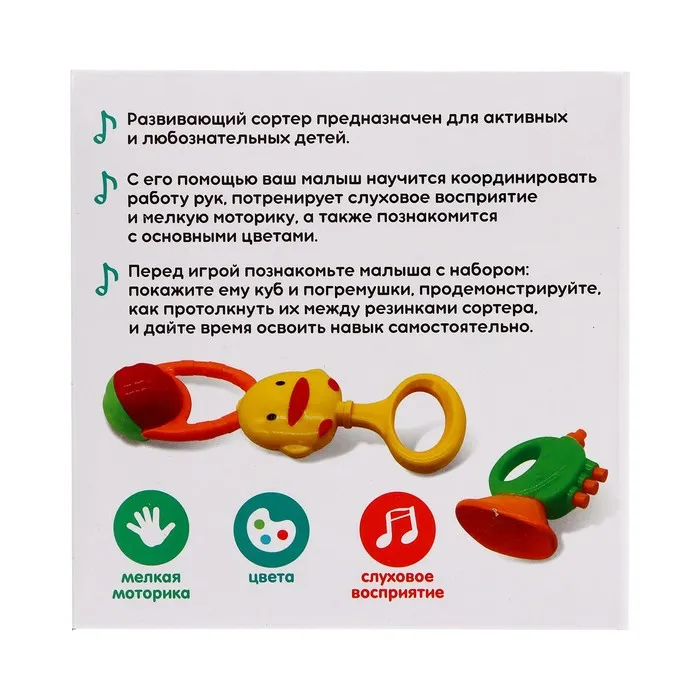 - Внутри вы найдёте сортер с резиночками и 6 красочных погремушек.