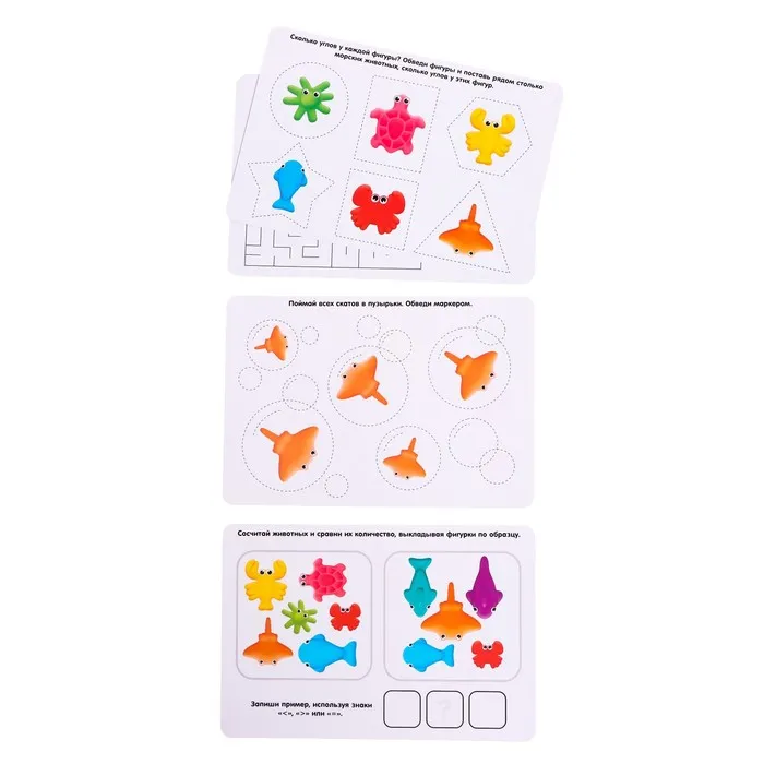 - Например, поймайте всех скатов в пузырьки и обведите маркером, сосчитайте животных, сравните их количество и выложите фигурки по образцу.