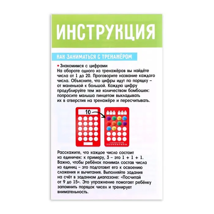 - На обороте одного из тренажёров вы найдёте числа от 1 до 20. Попросите ребёнка проговорить каждое число.