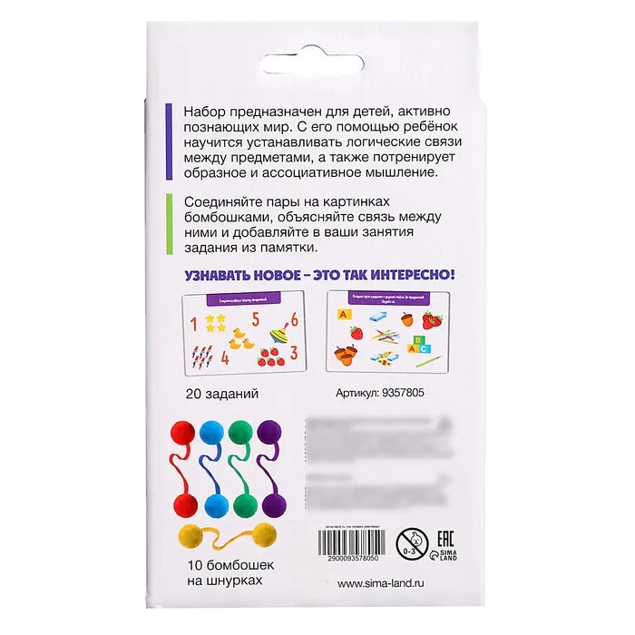 Внутри вы найдёте 10 цветных бомбошек на шнурках и 20 заданий.